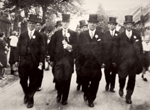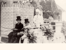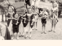 Het ophalen van de koninklijke familie uit Engeland. Voor de wagen staat het paard Pukkie. Midden achter staat Wil van Velthoven. Daarvoor in matrozenpakjes zijn Wim en Gerard van Velzen. Het echtpaar is Stien van der Marck uit Valkenburg getrouwd met Piet Eykelenbroek (beter bekend als Piet de slager). Op de voorste rij zitten van rechts naar links: Hein, Riet (met strik) en Henny van Velzen en……
