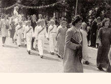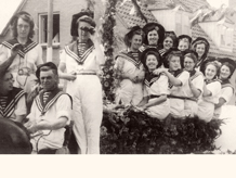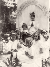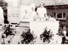 De optocht passeert hier de Antoniusschool met een voorstelling van Indië in de rust voor de Japanse bezetting. Enkele dames uit de grote kruideniersfamilie Van Kampen. Mien en Nel? Ook Sjaak Remmerswaal en Henk van Kampen staan mogelijk op deze foto.