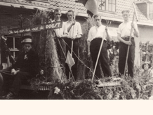 Na de hongersnood van de oorlog was het logisch dat er een oogstwagen in de optocht mee zou rijden. Eerste rij achter de koetsier: Piet Tetteroo; verder Bert van Kampen, Kobus van Wouw van de Boekhorstlaan en Dirk Ruijgrok en staan ook op de wagen. Eerste rij rechts: Tinus Bel.