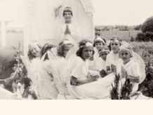 Een schitterende wagen welke het gebed symboliseert dat zo velen gebeden hebben, Maria Koningin van de Vrede bid voor ons. Op deze wagen meisjes uit de omgeving van de Rijnsburgerweg. Claartje Ottenheim ziet haar dochtertje Riet maar ook Lien Roozen, Krina en Rietje Langeveld en Annie en Gree van der Hulst. Op de achtergrond staat de zweefmolen op het bijveld van R.K.S.V. Foreholte, nu het Kievitspark. Rechts de bloemen- en bollentuin van Cees van Werkhoven tegenover de kapsalon van Peters.