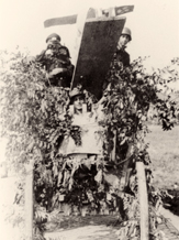 Met behulp van twee paardenwagens, kaasplanken en een namaak V1 reed zwaar gecamoufleerd een heuse startbaan mee. De Voorhouters, in gestolen Duitse uniformen, hadden veel succes. Jan van der Vlugt was de koetsier. Het paard was van zijn vader Maarten. Piet van der Zwet uit Sassenheim, Cor van der Vlugt en Leo van der Vlugt maakten dit ‘commando’ compleet.