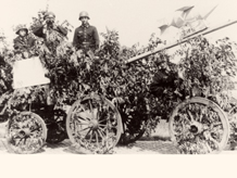 Dit cabaret maakte gedurende de oorlog de geallieerden belachelijk [?]. Het paard voor de wagen had alle kleuren van de regenboog. Wekenlang liep dit beest zo in het land. Links Theo de Jong, Nico Ruijgrok, Bert van der Hulst, Arie Hoek, Joop Warmenhoven, Jan de Jong en Toon de Groot.