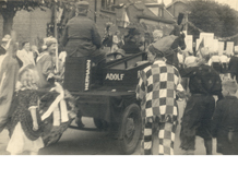 21. De groep Boekhorstlaan toont de afschuwlijke wandaden van het Nazi-regime. Een volgwagen met de dood en enige Duitse soldaten in een doodskist met het opschrift RUST HARD. 22. Annie de Jong (van de Spar) men haar vriendin Riet Borst (dit zou Joop Warmenhoven moeten zijn) met hun fiets met massieve banden, genaamd anti plof banden omdat lekke banden niet voorkamen. 23. A.I. Deutekom uit het eerste Oranje Comité van na de oorlog heeft zo jacquet de hele oorlog zorgvuldig bewaard en poseert nu met een Indische  dame die even van de wagen is gestapt. Deze Indische is waarschijnlijk Bets Jonker.