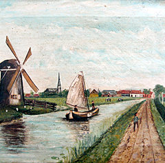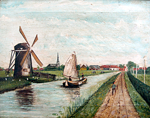 Gezicht op Voorhout vanaf de Trekvaart met onder meer de Boekhorstmolen, de kerk en boerderij de Knip van Hein Langeveld. Olieverfschilderij op doek in lijst van C.C. Plug, Golfweg 22 [Noordwijk]. Geschilderd naar een ansichtkaart van J. Braakman. 40 x 50 cm. ZJ.