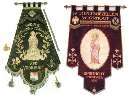 De St. Jozefsgezellen zijn opgericht op 27 november 1921. In de Katholieke Illustratie van 30 december 1925 is sprake van ‘het nieuwe vaandel der St. Jozefsgezellen.’ Voluit is de naam van de vereniging R.K. Bouwvakarbeiders Bond St. Joseph. Afd. Voorhout. De firma P.P. Rietfort uit Haarlem maakte het vaandel. Linksboven op het rood fluweel staat onder meer de passer afgebeeld en rechtsboven het wapen van Voorhout. Aan de onderzijde staan links en rechts een lelie. De spreuk luidt: ‘God zegene het eerzame handwerk’. Volgens een kleine foto in de hoort er een bovenstuk met kruis op het vaandel. Dit kruis ontbreekt. Mogelijk is hiervan een replicatie te maken. Op een foto van de toneelafdeling van de St. Jozefsgezellen (Vader Kolping) staat op de achtergrond het vaandel. Over de schrijfwijze van de vereniging doen vele variaties de ronde. Dit vaandel geeft aan wat de schrijfwijze van de vereniging was.