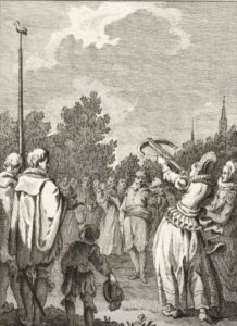 Voorhout, 9 september 2017 – Jacoba van Beieren schijnt bij de bevolking van Goes zeer populair te zijn geweest. Zij leefde, ondanks de voor haar treurige gebeurtenissen, geheel met de bevolking mee. Volgens het verhaal hield de schutterij van Goes een grote wedstrijd, waarin het er om ging een vogel op een paal te raken. Jacoba, vol waardering voor de vermaken van haar onderdanen, vroeg of ze ook eens mocht schieten en raakte meteen de papegaai, tot grote vreugde van de aanwezigen, die haar luid toejuichten en haar tot koningin van het feest benoemden. Nog in deze eeuw kon men de moerbeiboom aanwijzen, die Jacoba eigenhandig geplant zou hebben in de noordwestelijke hoek van het slotplein van Oostende. Wat ligt er meer voor de hand om met de Jacobatocht naar Goes te gaan.