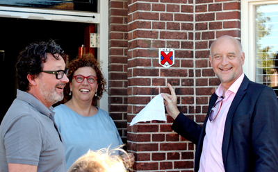 Wethouder Arno van Kempen memoreerde het belang dat het gemeentebestuur hecht aan ons erfgoed waarbij er nu ook aandacht is voor immaterieel erfgoed. In de lopende raadsperiode moet daarvoor een verordening worden voorbereid en goedgekeurd. Naast de bekende rijks- en gemeentelijke monumenten is er nu een lijst van 75 objecten die de moeite waard zijn om als beeldbepalend te worden aangewezen. Het is nu aan de bevolking en gemeenteraad om er vervolg aan te geven. Voor de geïnteresseerden is er op dinsdag 24 september een inloopavond over dit onderwerp. Het ensemble waar we nu te gast zijn staat ook op de lijst. Deze kwekerswoning is daarmee een terechte prijswinnaar. De wethouder en de eigenaren onthullen vervolgens gezamenlijk het HKV schildje naast de voordeur dat de toekenning van de restauratieprijs illustreert. Foto: Het HKV-schildje wordt onthuld door Stan en Marjolein Uljee met de hulp van wethouder van Kempen.