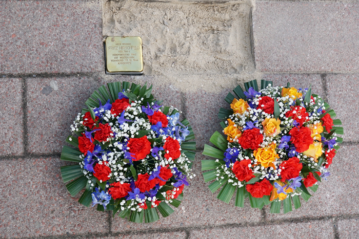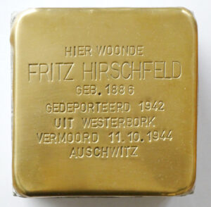 De struikelsteen glanst nu in het looppad voor de Plus van Dijk winkel. Voor de voorbijgangers, ter herinnering aan Fritz Hirschfeld die in Nederland en Voorhout bescherming en veiligheid zocht. Dat hebben we hem niet kunnen bieden en hij werd vervolgens omgebracht. De steen dient ook als waarschuwing voor de verschrikkingen die mensen elkaar kunnen aandoen en waarvoor we waakzaam dienen te blijven. Vrijheid is immers niet vanzelfsprekend en moet doorgegeven worden. Ook de HKV-uitgave Leven in VRIJHEID schenkt aandacht aan de verschrikkingen van de oorlog en Fritz Hirschfeld.