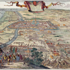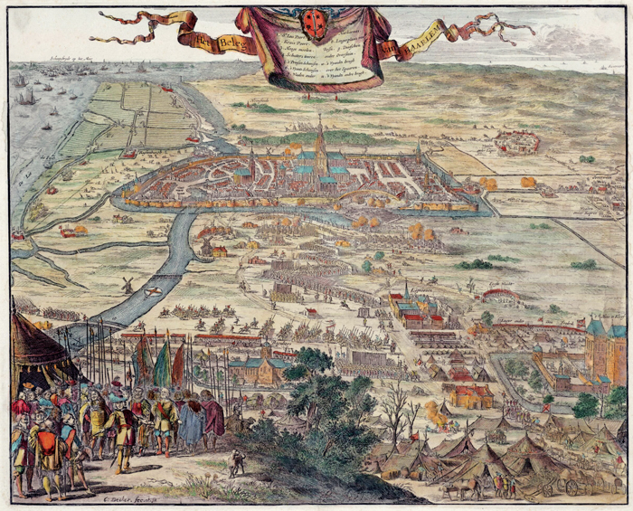 Kaart van het kampement tijdens het beleg van Haarlem in 1573. Linksboven het Haarlemmermeer. Het zuiden (richting Voorhout) ligt bovenaan. Tekening Coenraet Decker, 1681.